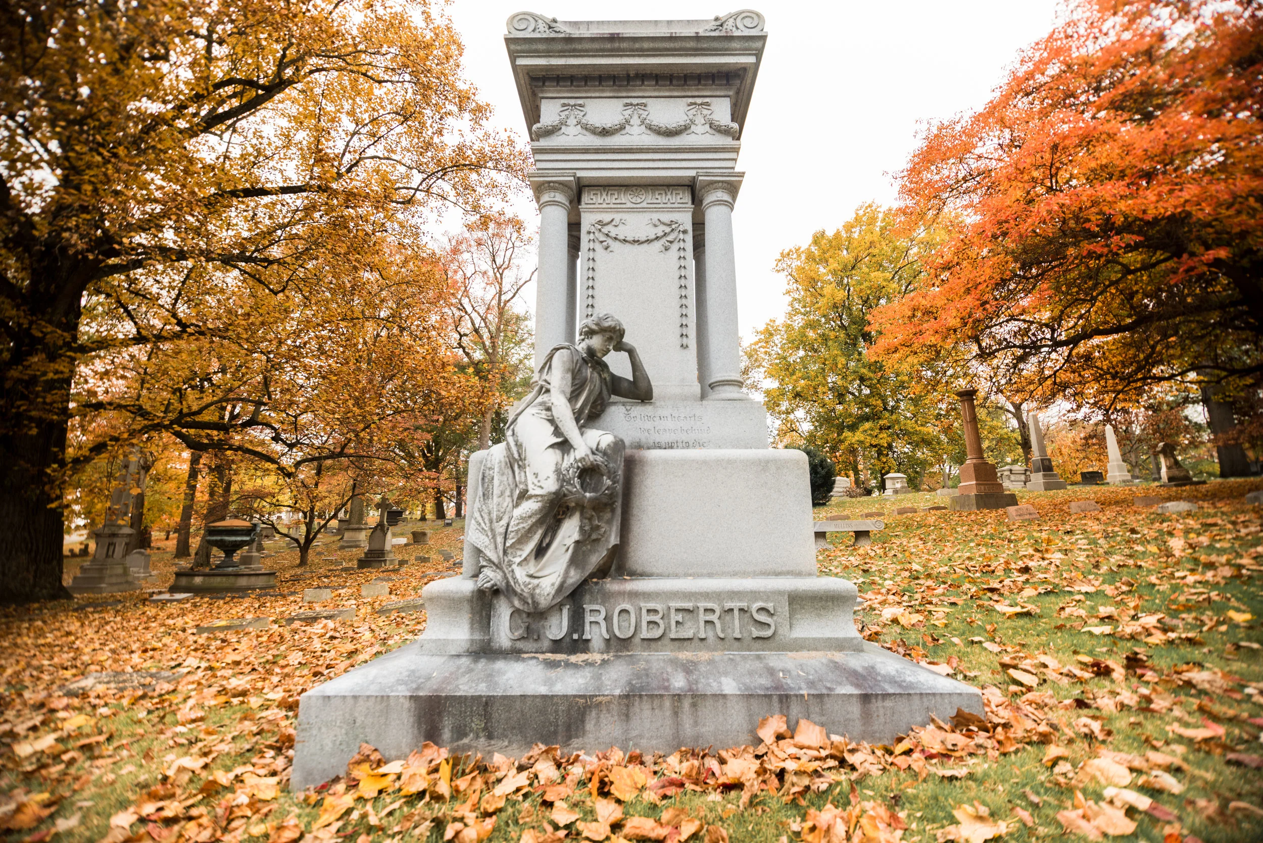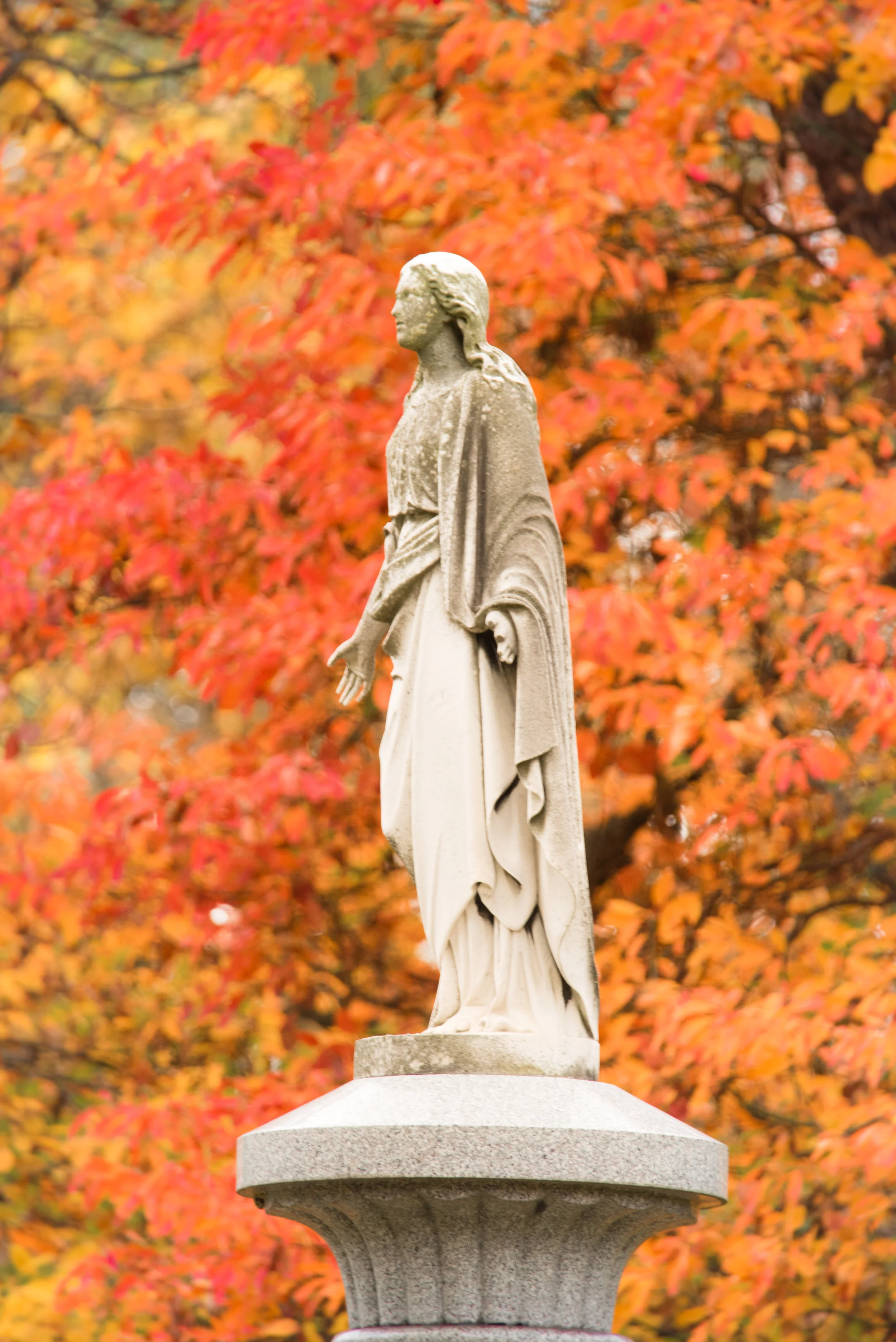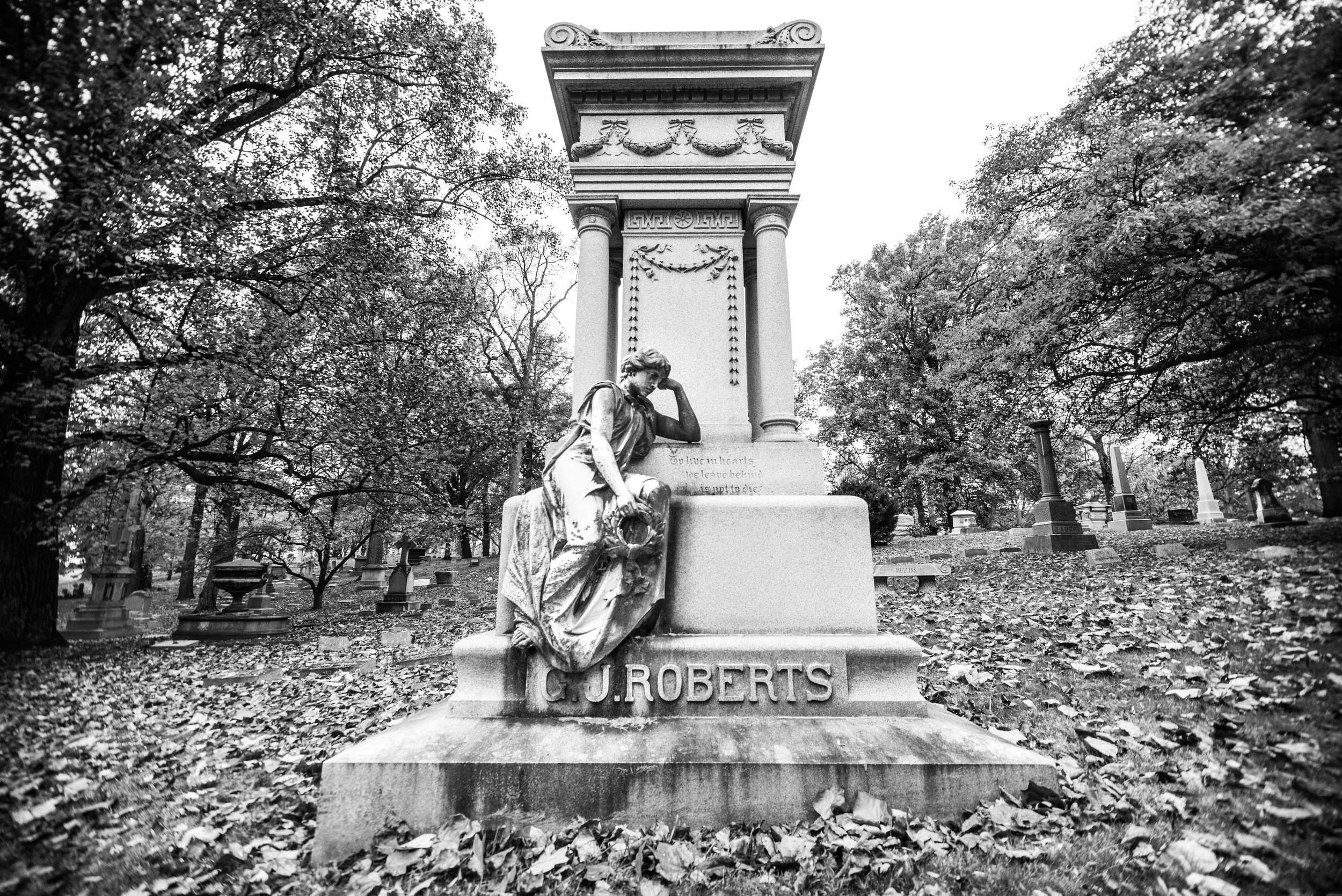 Quick visit to Woodlawn Cemetery yesterday, hoping to catch some fall colors. While the colors were beautiful, overcast skies were hard to manage. My favorite shot was this conversion to black and white.